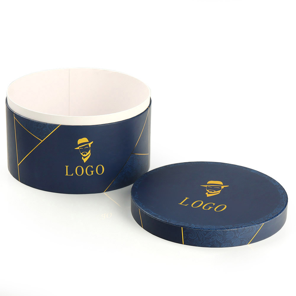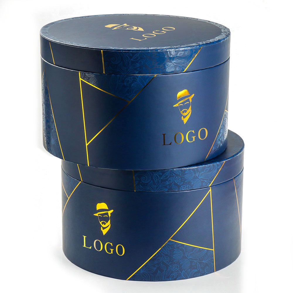 The custom-printed round gift packaging box, with its unique design and exquisite craftsmanship, has become a striking feature in gift packaging. It uses a deep blue as the main color, complemented by gold lines and patterns, giving it a noble and elegant appearance. The carefully designed logo and "LOGO" lettering on the box not only showcase the brand's unique personality but also add a touch of exclusive sophistication to the gift.