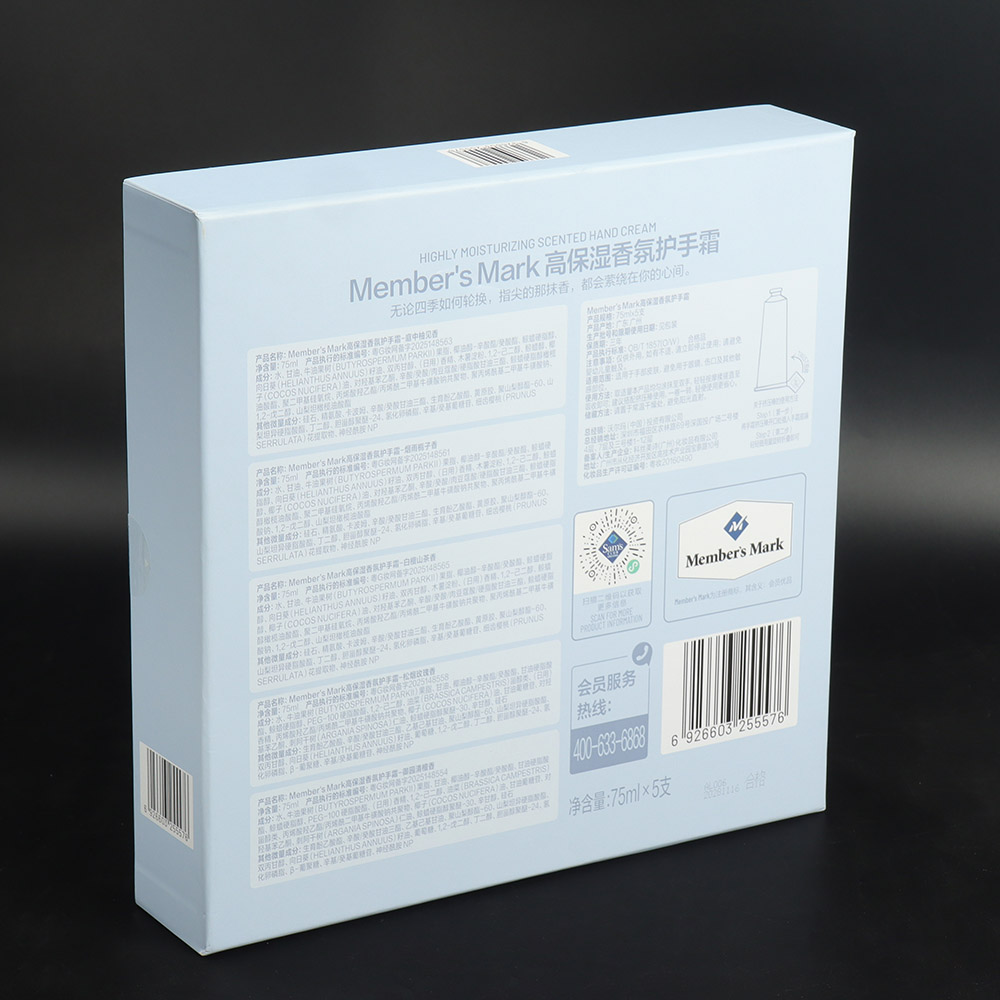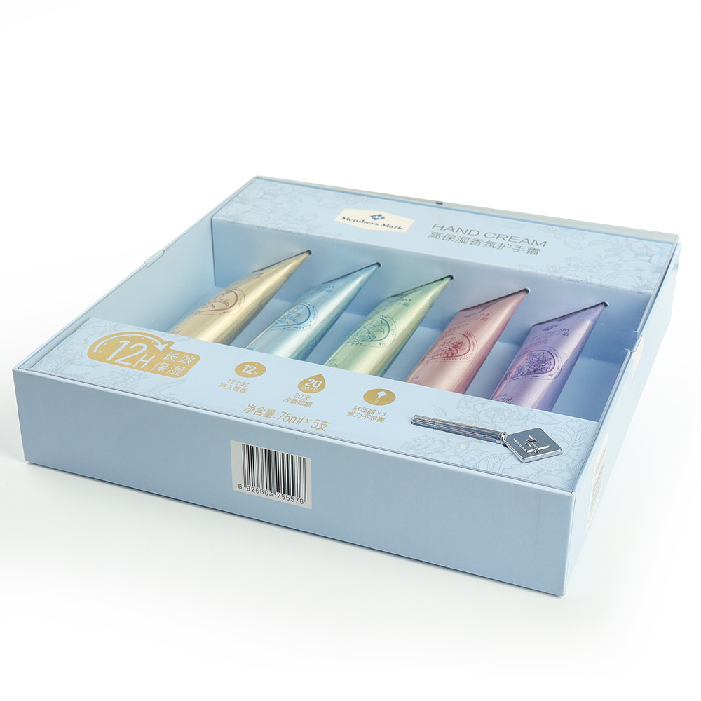 This hand cream gift set features a unique and thoughtful packaging design, particularly evident in the clever combination of custom printing and a transparent window. The paper window boxes uses a soft, light blue as its main color, giving it a fresh and elegant feel. The custom-printed brand logo on the surface adds a touch of sophistication and brand recognition. The transparent window is a major highlight, allowing a clear view of the product's colors and arrangement without opening the personalized paper box. This design not only showcases the product effectively but also sparks curiosity. Such packaging is not only a perfect complement to the product but also a visually appealing gift presented with care.
